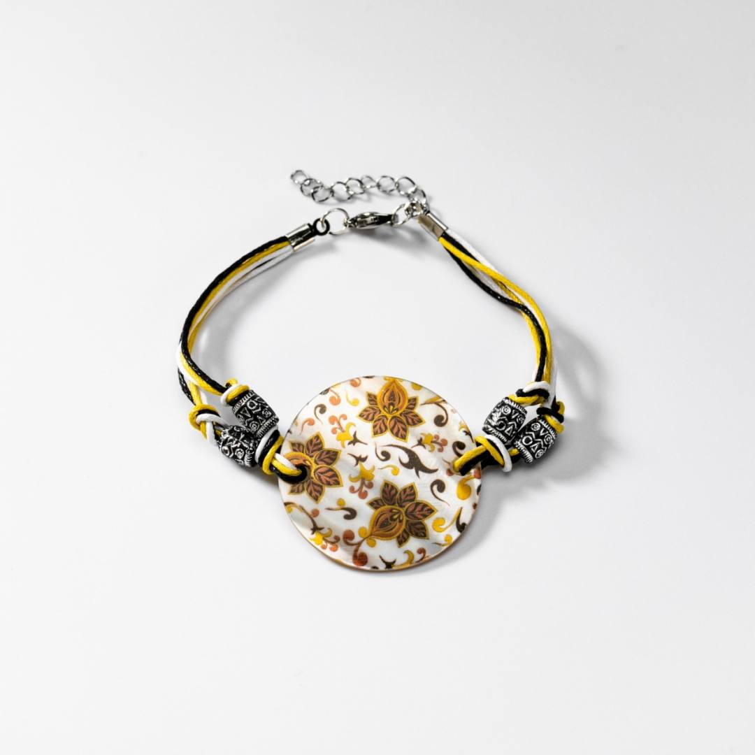 Verstellbares Armband aus einer Perlmutter und weißen, schwarzen und gelben Stoffkabeln mit einem hypoallergenen Metallverschluss. Die weiße Perlmutter ist mit warmen Farbblättern und Blumen angereichert, die sich an die Herbstsaison erinnern. Abmessungen: - Durchmesser 4 cm; - Länge 27 cm.