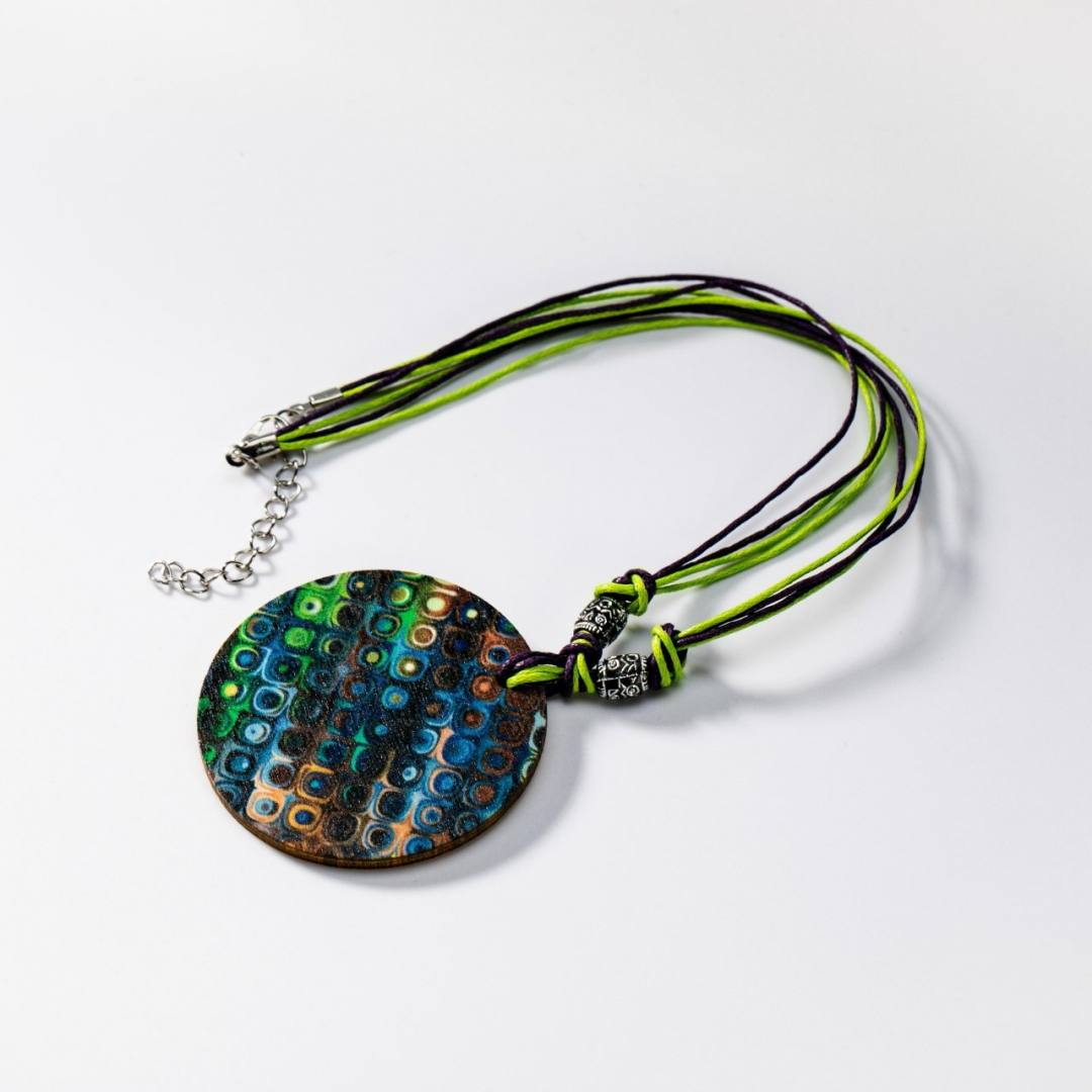 Halskette und Ohrringe Set: Die Halskette besteht aus einem gedruckten hölzernen Anhänger und lila und grünen Stoffkordeln. Die Ohrringe bestehen auch aus einem gedruckten Holzanhänger mit einem hypoallergenen Metallhaken. Dank seiner kalten Farben ähnelt der Druck dieses Sets den Fliesen eines Mosaiks.